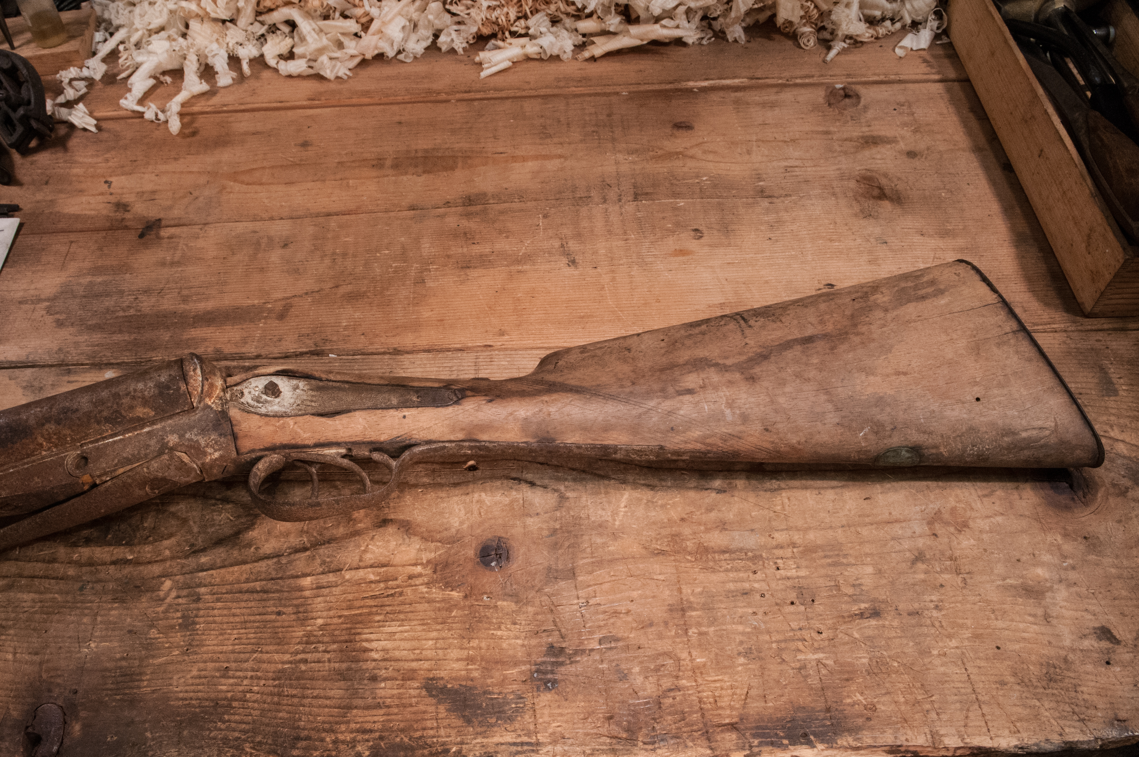 This old Coleman 10 gauge shotgun has been in my family for over 100 years, originally belonging to my great-grandfather. When I was growing up, I remember seeing it in the “meat house” on my grandmother’s farm. The meat house was really nothing more than a shed, a precarious structure that had a dirt floor and a pretty serious lean to one side. Even then, the gun was little more than rust and bleached wood. In the late 1970s, out of safety concerns, the meat house was emptied and demolished (actually, a couple of us just gave it a good push and it collapsed). The shotgun was one of the many items removed and it found a new home in my parent’s attic. There it stayed for another 30 years until my mom finally sold her house and moved into a senior home. The gun was passed around a little over the last 8 years until finally finding its way back to me earlier this year.