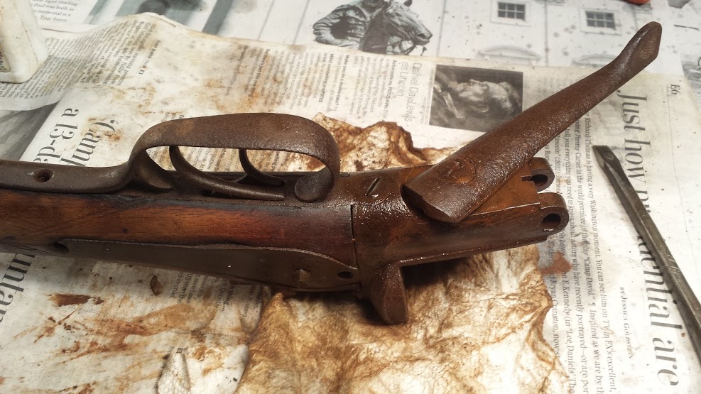 Cleaning up the barrels was relatively straightforward. I removed the rust using a soft steel wheel brush on a large powered grinder, finishing up with more brushing by hand. You see in the photo below the pitting from years of rust and neglect. I applied a little cold blue to darken the metal to approximate a pretty nice looking aged patina. Although the photo flattens it out, there’s actually a pretty nice luster to the metal. There was one small dent at the very end of one barrel that was easy to hammer out using a wooden dowel and a nylon hammer. I ran a brush and then a rag through both barrels to clean out the loose rust.