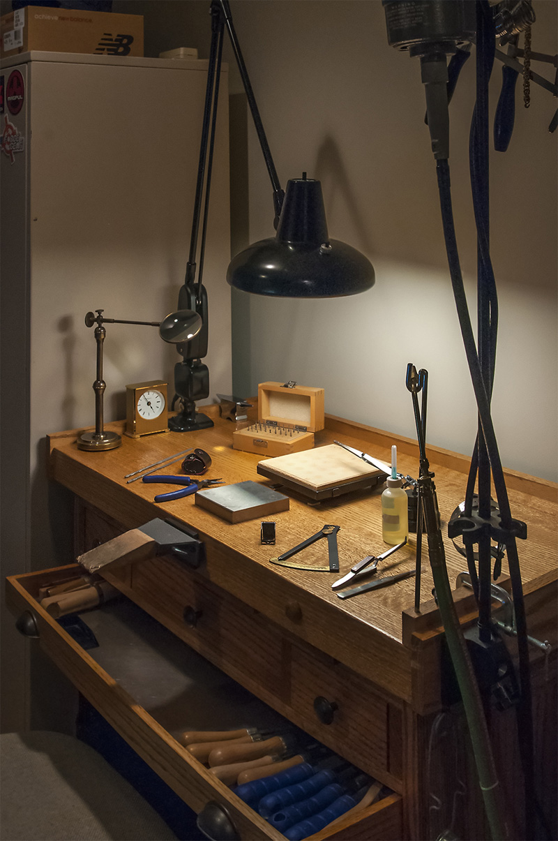 wathcmakers benchWatchmaker’s benches typically differ from jeweler’s benches in both function and design.  Generally forgoing the lap drawer, watchmaker’s benches are easily identified by the plentiful small drawers and cabinets for storing parts and tools. Earlier benches often had a foot treadle for powering the watchmaker’s lathe built right in. These were often magnificent pieces of furniture, with a charm and character unique to the profession.  It was also common for them to have lockable enclosures such as hinged lids or roll tops to prevent opportunistic theft of valuable tools and materials.