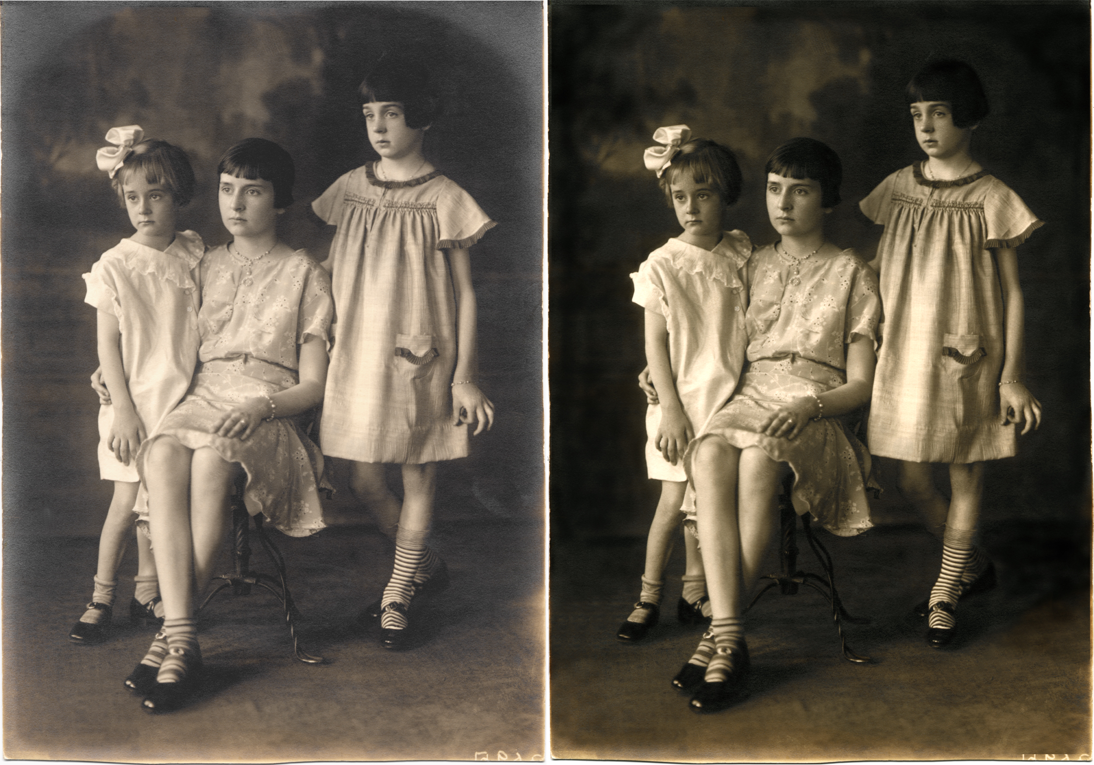 This is a family photo of my mother and her sisters (c. ~1932) that I restored for her 10 years ago. The original photo shown on the left was scanned at a high resolution. You can see evidence of the silver oxidation and fading, especially around the edges. Restoration was accomplished through digital manipulation using Adobe Photoshop . The restored image, shown on the right, was then printed on special 100% cotton paper using archival inks.
