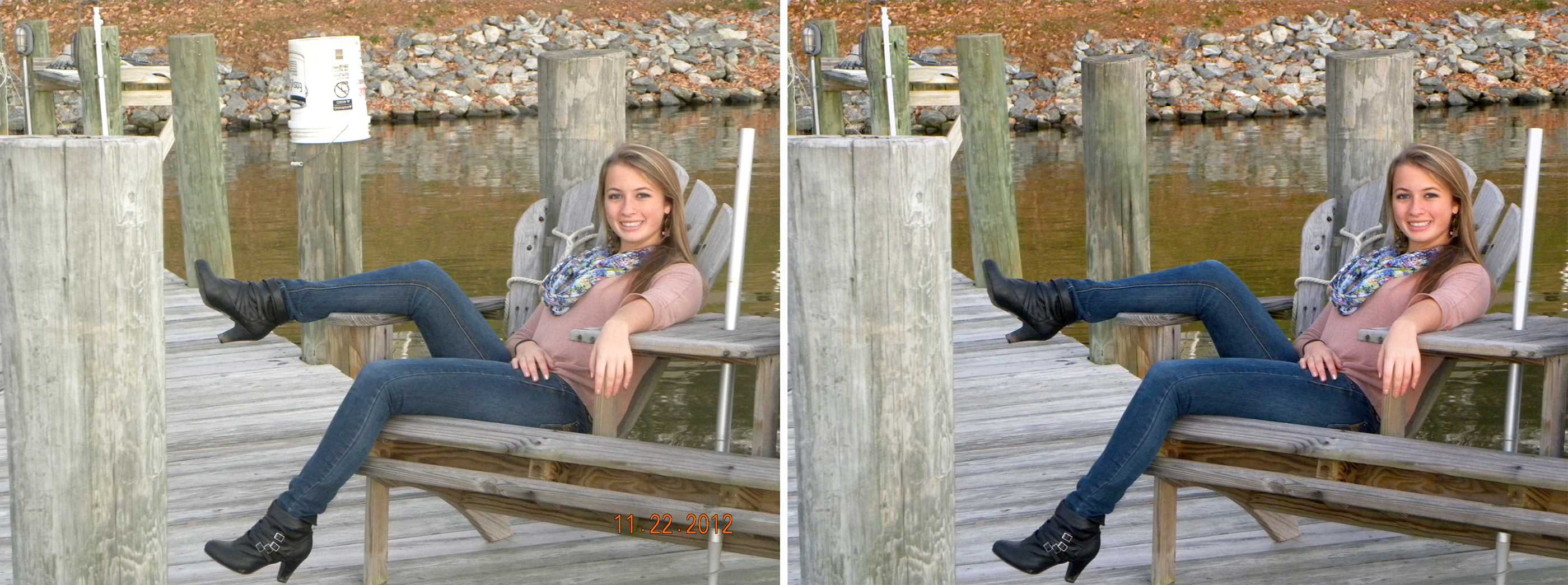 The original photo of this lovely young lady featured an unfortunately placed bucket. I removed the bucket, painted in the piling, removed the red date stamp, and corrected the contrast and saturation.